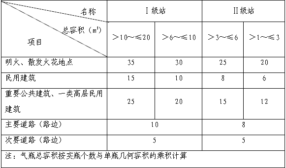 1 、瓶裝供應(yīng)站應(yīng)按其氣瓶總?cè)莘e V 分為三級(jí),即Ⅰ級(jí)站( 6 m 3 < V ≤ 20 m 3 )、Ⅱ級(jí)站( 1 m 3 < V ≤ 6 m 3 )、 Ⅲ級(jí)站 ( V ≤ 1 m 3 )。