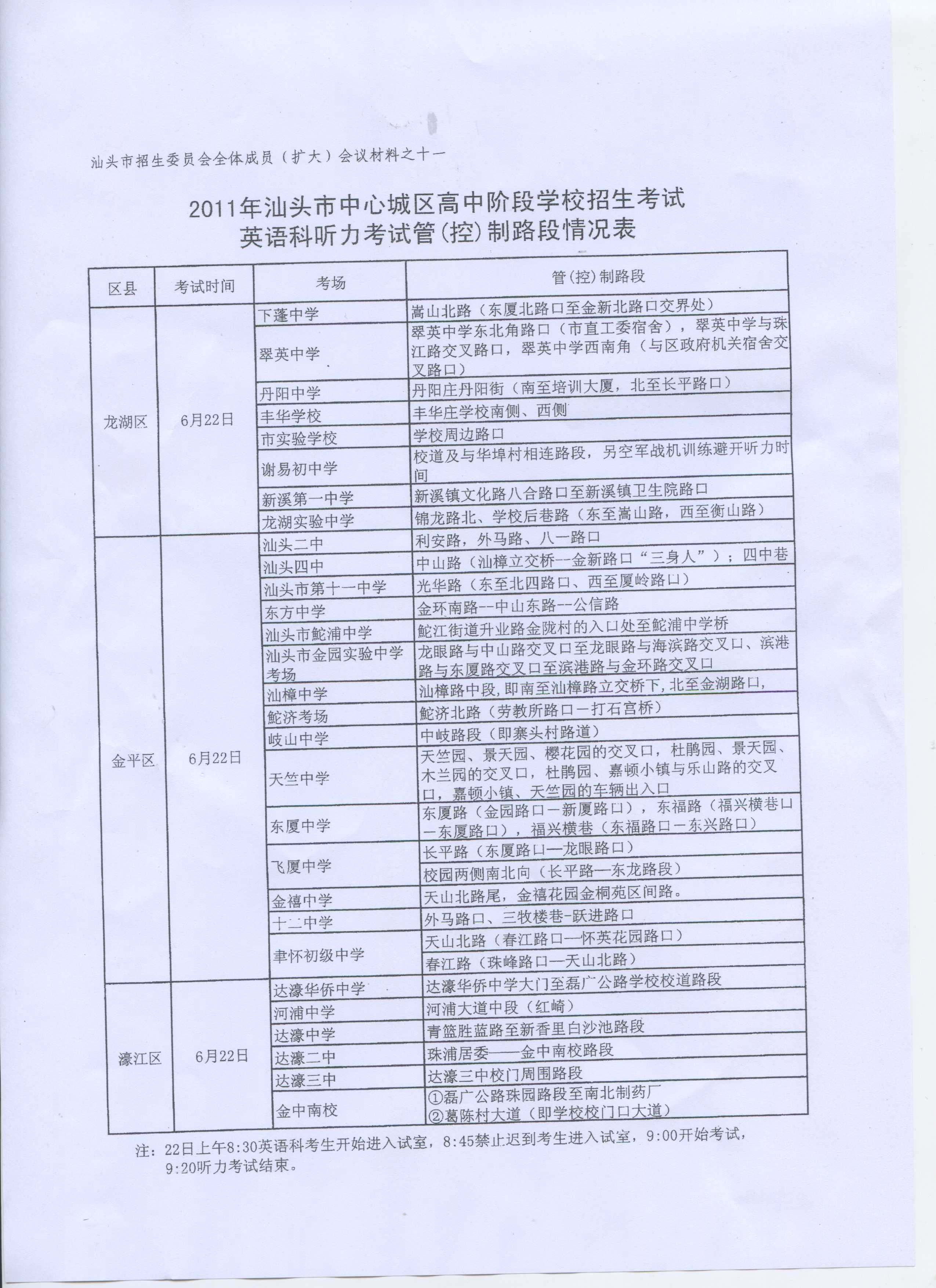 附件:2011年汕頭市中心城區(qū)高中階段學(xué)校招生考試英語科聽力考試管(控)制路段情況表