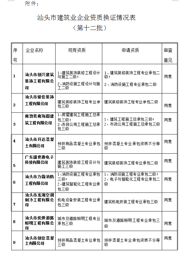 關于建筑業(yè)企業(yè)資質換證審查意見的公示(第十二批)汕住建公示 [2016]40號