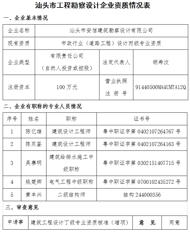 關(guān)于工程設(shè)計企業(yè)資質(zhì)審查意見的公示汕住建公示〔2017〕16號
