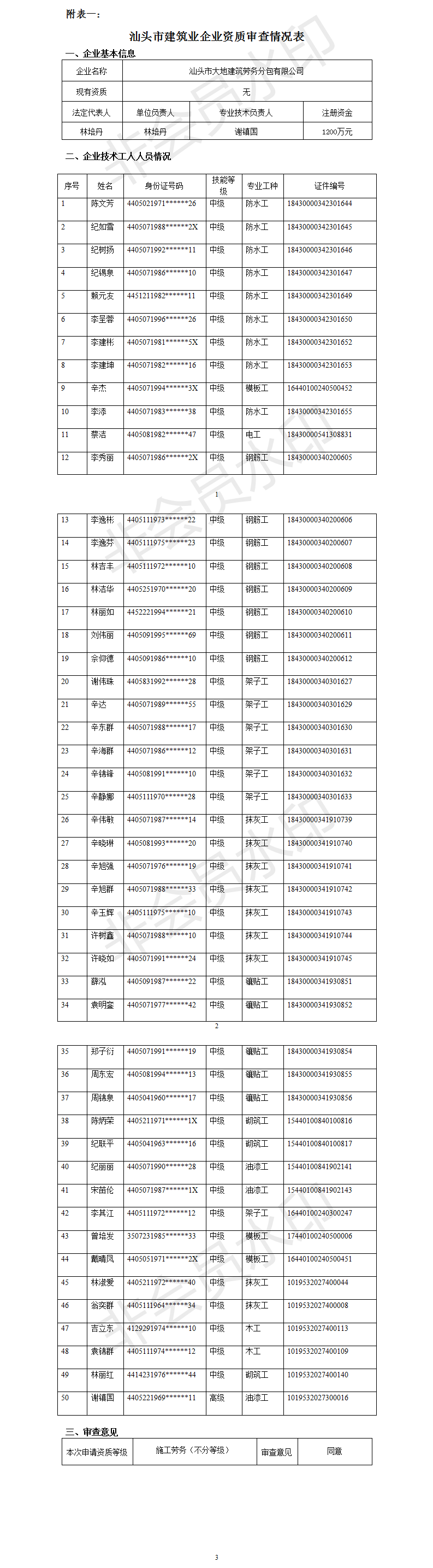 瀏覽次數(shù):5183按照《中華人民共和國行政許可法》規(guī)定以及《建筑業(yè)企業(yè)資質(zhì)管理規(guī)定》(住房城鄉(xiāng)建設(shè)部第22號令)、(住房城鄉(xiāng)建設(shè)部關(guān)于印發(fā)《建筑業(yè)企業(yè)資質(zhì)標(biāo)準(zhǔn)》的通知)(建市[2014]159號)的要求,我局對近期申請建筑業(yè)企業(yè)資質(zhì)的汕頭市大地建筑勞務(wù)分包有限公司申報材料進(jìn)行了審查,現(xiàn)將審查意見予以公示 (見附表) 。